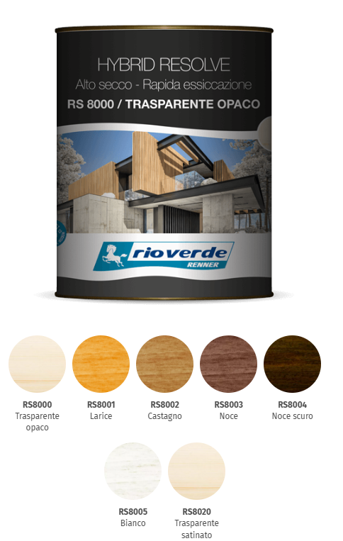 Hybrid Resolve è l’impregnante di finitura ad alto secco. Essicca con estrema rapidità ed esprime un design dall’apprezzato effetto naturale. Hybrid Resolve è un sistema verniciante a base acqua formulato con resine alchidiche uretanizzate ad alto solido e copolimeri acrilati. Si oppone con efficacia all’aggressione degli agenti atmosferici. Gli speciali assorbitori UV+ bloccano in superficie le radiazioni ultraviolette e proteggono la lignina. Hybrid Resolve è un concentrato di tecnologia per la longevità del legno in esterno. Grazie alla formula self-consuming, evita lo sfogliamento. Questo ritrovato crea una velatura omogenea, ma non filmogena. Con Hybrid Resolve le operazioni di mantenimento e ripristino tradizionalmente complesse e impegnative, possono finalmente essere gestite senza carteggiatura. La versione trasparente opaca e satinata, priva di ossidi di ferro, non può garantire la stessa durata del prodotto pigmentato; non impiegare su impregnanti e finiture bianchi.